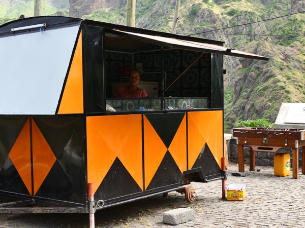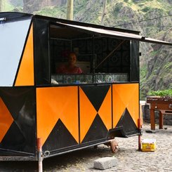 Das letzte Stück unserer Wanderung führte uns dann über die neu erbaute Strasse von "Fragata" nach "Ribeira Prata". Auf dem ersten Meter der Strasse überraschte uns ein Street-Food Wagen ohne Räder in dem diverse Getränke angeboten wurden. Klar haben wir hier unseren Lunch gegessen, zusammen mit einem kühlen "Strela". Der letzte Teil des Weges nach "Ribeira Prata" brachten wir rasch hinter uns.