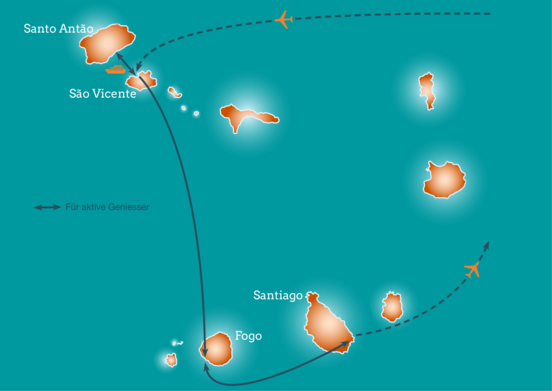 Bei dieser speziellen Rundreise haben wir darauf Wert gelegt, dass Sie die Kapverdischen Inseln mit ihren Besonderheiten und ihrer Vielfalt kennen lernen, allerdings auch Zeit für sich haben. Deshalb haben wir in diesen Tagen Unterkünfte ausgewählt, die Aufenthaltsqualität haben. Genießen Sie in Mindelo den Sonnenuntergang mit Blick auf den Monte Cara. Beobachten Sie mit Glück von Ihrem Balkon Ihrer Unterkunft auf Santo Antão die Schildkröten im Meer. Spüren Sie die Energie des Vulkans in der Chã das Caldeiras bei guter Hausmannskost und dem besonderen Tropfen „Cha“-Wein. Entspannung mit Stil folgt am Ende auf Santiago.